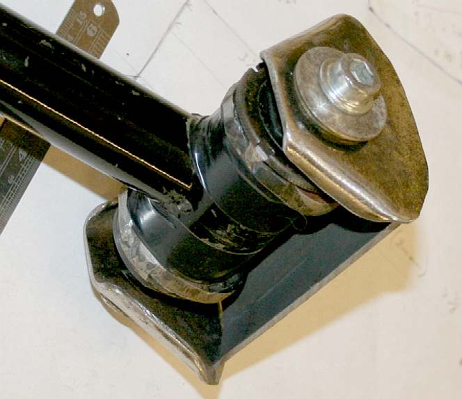 BONE YARD - The main components of the neck joint before the all important central plate, or yoke, is inserted between hinge axis and welded to the hinge plates of the head frame (left). In automotive terminology such 90 degree opposites are called universal joints. We'll be using custom made (heavy-duty) bearing blocks on production models.