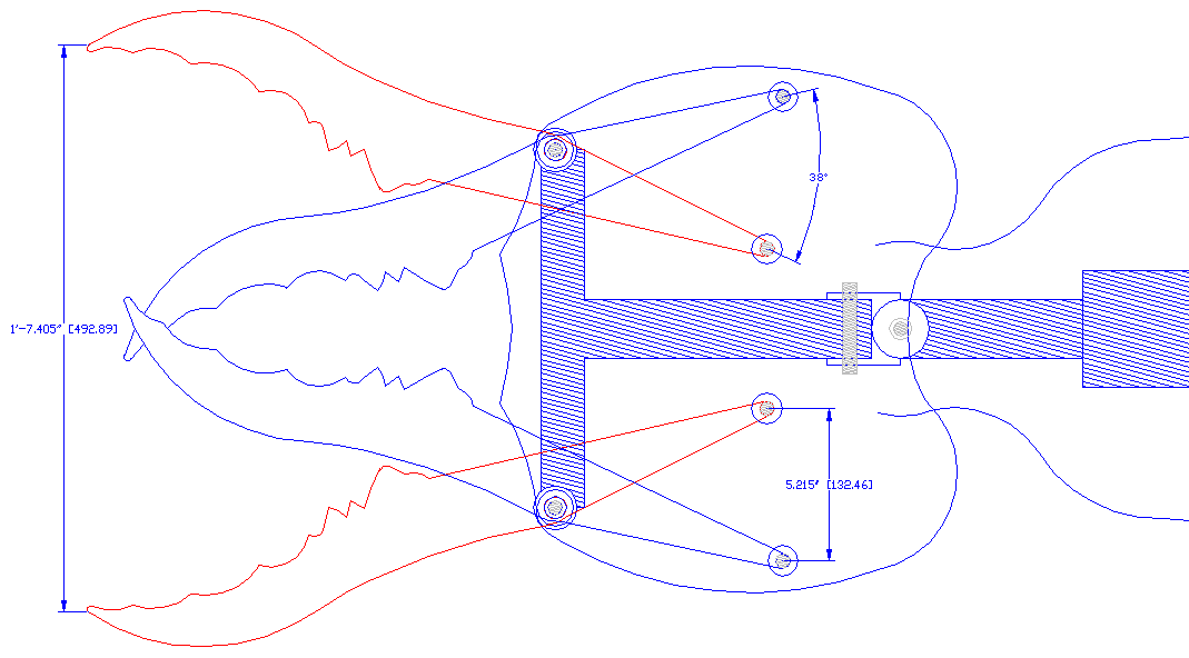 OPEN WIDE - You can see from the CAD plot above that the jaws open to 19" (490mm) from a 10" (250mm) input lever - almost a 50% mechanical disadvantage. In other words we've had to revise the ratios a little. We cannot make 60 pounds (27kg) of closing force at the tips without introducing more reduction gearing. Inefficient though it may be, our bargain servo will drive a 14mm x 2mm screw thread into threaded swivel blocks on either inboard end of the jaws, via a 3:1 reduction, multiplying our 40 lbs of force x 3 (minus losses) to give around 120lbs (54kg) of crushing strength. Some of you may have noticed that the head articulation is exactly the same 3 axis arrangement as a human arm - from the shoulder to the elbow, though why all the fascination with humanoids when humans cannot perform anywhere near as well as other animals.