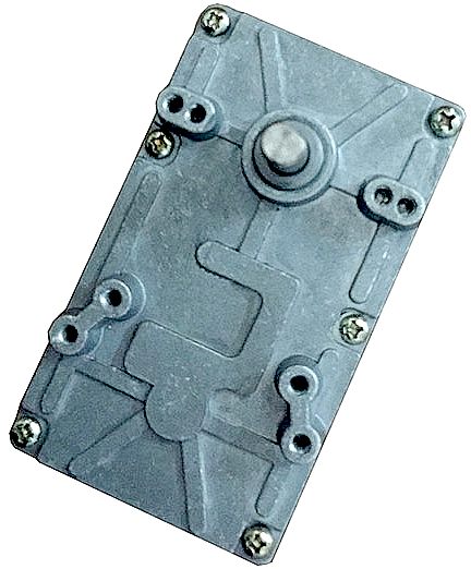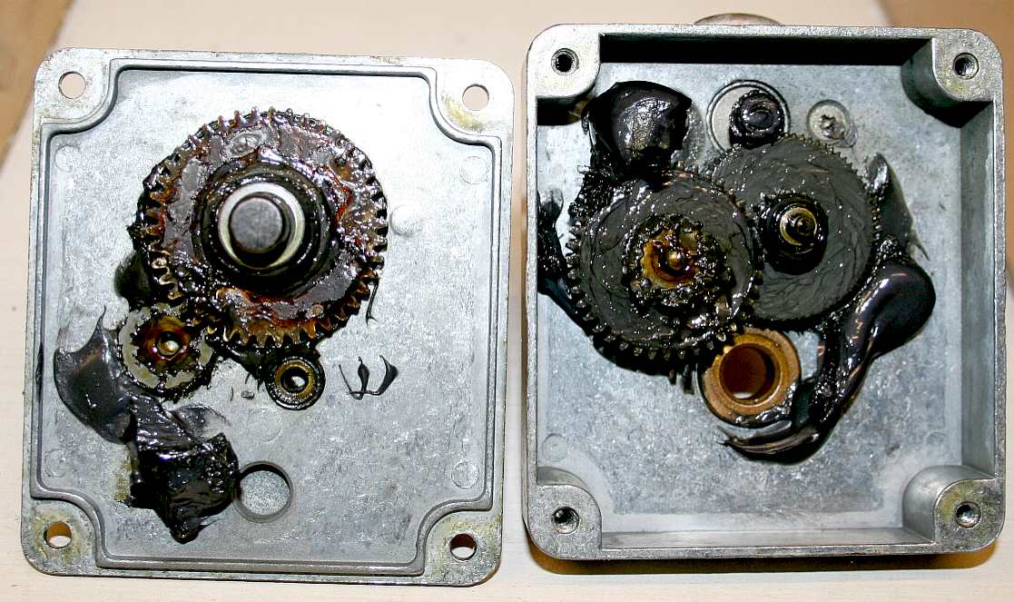 HEAD DUTY GEARBOX - The internals of the head/neck servos. Note the steel gears that start at the motor with fine teeth, getting progressively more coarse during the three stages of reduction gearing until the output shaft, and the large phosphor bronze output shaft bushes that have been packed with molybdenum disulphide grease to prolong service life. To extend working life even further and improve efficiency, you would need to seal the casing and use a good quality gear oil in place of grease. Grease at low temperatures is thick enough to cause high drag. Please note that this photograph is Copyright © Jameson Hunter Ltd., 2 January 2016. All rights reserved. You will need permission from Jameson Hunter to be able to reproduce it.