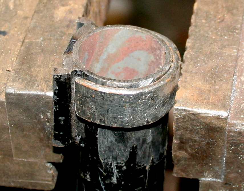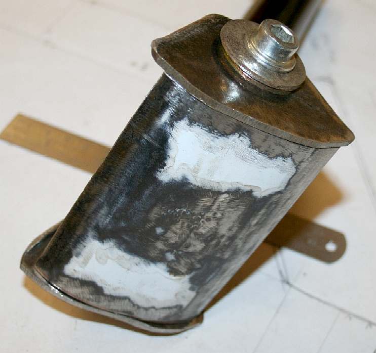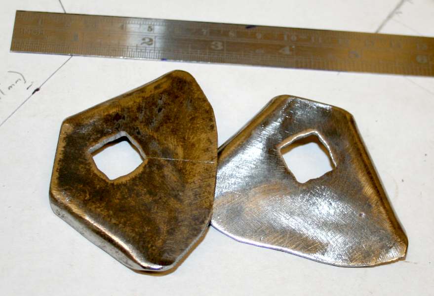 NECK JOINTS - Having drilled and shaped the holes to fit onto the push-bike crank, the rough blanks then need to be folded to give additional strength to the joint. The 15mm holes are no longer round, but tending to square. Please note that this frame is Design Copyright and that this photograph is Copyright © Jameson Hunter Ltd 28 January 2016. All rights reserved. You will need permission from Jameson Hunter to be able to reproduce it.