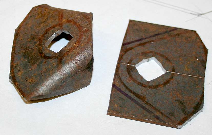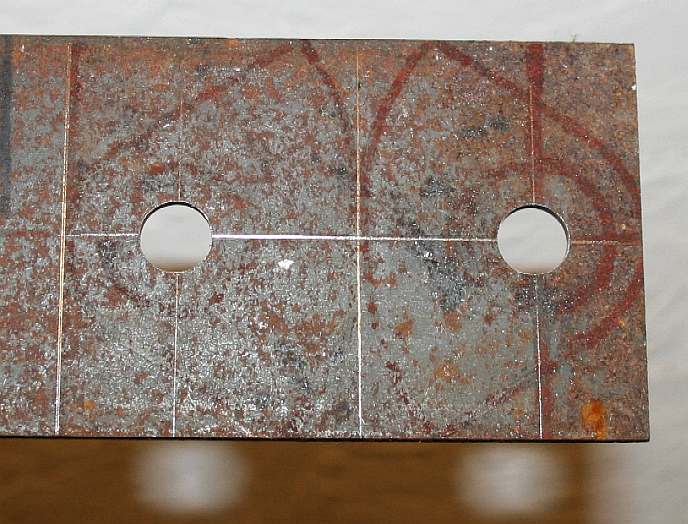 NECK JOINTS - Coming back to the neck joint, we need to make two steel plates to bolt to and come off the modified crankshaft bearing. Mark the outline of the plates in felt marker and scribe in the centers, then centre punch. Please note that this frame is Design Copyright and that this photograph is Copyright © Jameson Hunter Ltd 28 January 2016. All rights reserved. You will need permission from Jameson Hunter to be able to reproduce it.