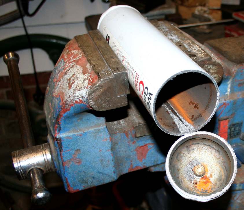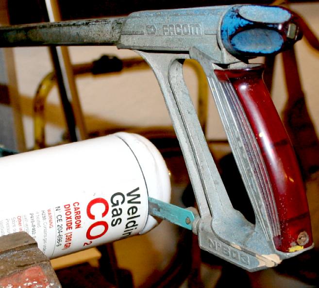 RECYCLE - The gas that is supplied to us in disposable cylinders for welding is also a source of reasonably thick wall steel that is curved, so is ideal for making parts, rather than being thrown out. Making sure that the CO2 is exhausted, we cut one end off a cylinder with our trusty hacksaw.