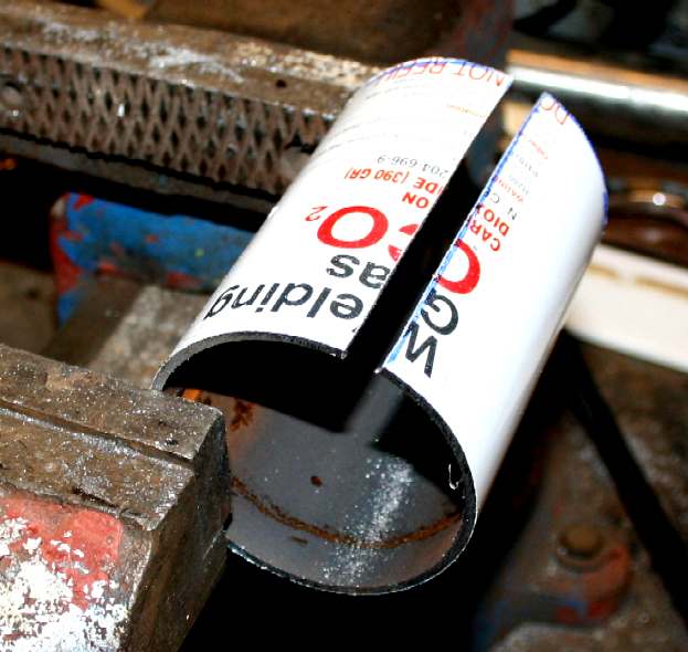 RECYCLE - Having marked out the section you need, cut the cylinder along its length and again to get a semi-circle of steel. In this case we wanted a yoke plate that curved around the main head bearing, so keeping the distance between one bearing plane and the 90 degree opposite - as close together as possible.