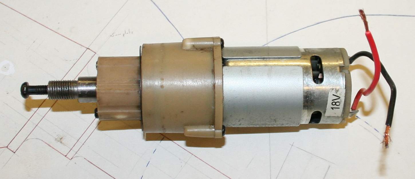 HEAD SERVOS - By comparison to the heavy duty RC servos used in most robot kits, the above units provide some serious grunt. They will take 12-24 volts without harming the motors - rpm is a product of voltage, so speed rises with voltage - something to remember when calculating the gearing. [LEFT] The motor is a Mabuchi 540 frame driving through a reduction gearbox with steel gears. Two of these will provide head left (shake) and right and up and down (nod) [RIGHT] This is a similar motor from a battery hand drill. The epicyclic gearbox has been hacked, removing the clutching spring and ball bearings that are used to dial in variable torque for driving screws, etc. You can lock the drive by securing the steel outer gear casing to the plastic drill casing. We've inserted a liner that is a tight interference fit. When taking these units apart, be sure to do so in a large bowl or other contained area, or you will lose some of the ball bearings from the front thrust bearing. Clean and re-lubricate on re-assembly.
