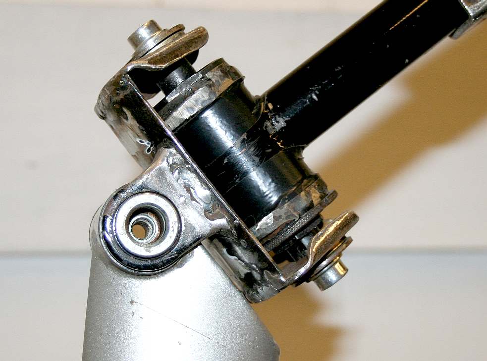 NO PEDALS - It may seem strange to see a bicycle crankcase without any pedals. Just wait until you see this head side-swivel bearing welded to the up-down bearing, that is the rear suspension bearing of the same donor bike. The point is that these bearings are strong enough and efficient enough for our purposes. SERVICING - Although the bearings have been cleaned and re-packed with molybdenum disulfide grease, to replace the bearings you will need to undo the two end bolts, drop out the packing washers and prise apart (open) the two end plates by about 3-4mm. This is by design to make a more robust unit. Please note that this frame is Design Copyright and that this photograph is Copyright © Jameson Hunter Ltd 28 January 2016. All rights reserved. You will need permission from Jameson Hunter to be able to reproduce it.